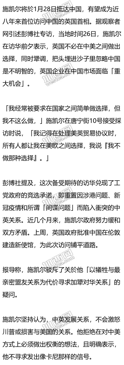 据英国《观察家报》此前报导,施凯尔计划於1月28日抵达中国,开启为期三天的访华行程。他有望成为近八年来首位访问中国的英国首相。