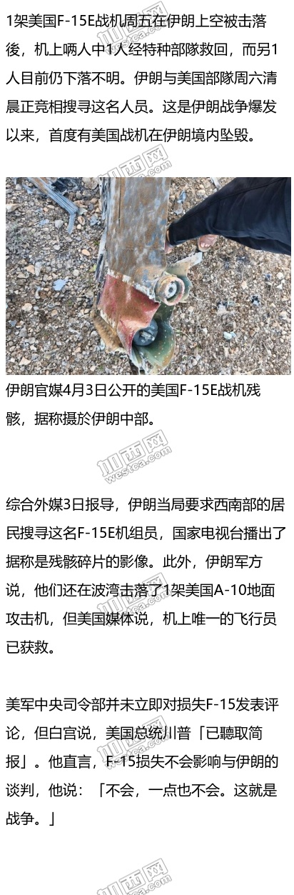 美国、以色列联攻伊朗的军事行动2月28日启动至今(4日)已35天,即使美国总统川普声称已经获胜,战火没有止息之势。华府宣扬美军对伊朗享有空中优势言犹在耳,伊朗昨天打下了美军一架F-15战机。专家认为此事对伊朗威望意义重大,这代表伊朗正挑战身为世界超级大国、在全球拥有军事主导地位的美国,战略升级;美方郄出现「任务缩小」的局面,政府高层已无法掌控局势,国际声望下滑中。