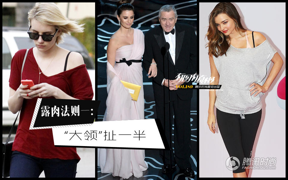 柔和的肩部线条是女人永不过时的性感本钱,西班牙美女佩内洛普克鲁兹在今年奥斯卡金像奖上的这套露肩礼服雍容华贵,礼服在设计上给了以丰满著称的大美女的圆润肩部一个华丽丽的亮相,真是让人大饱眼福。而米兰达可儿则将中性化的运动衫以随性的半露香肩的穿法穿出了青春又健康的性感气质。今年订婚的好莱坞四小花旦艾玛罗伯茨也不甘示弱,这张街拍闪瞎人眼的不仅有大钻戒还有半露的香肩。红色很衬艾玛雪白的肤色,而露肩设计又暗示着就要成家的她向熟女转型的讯息。