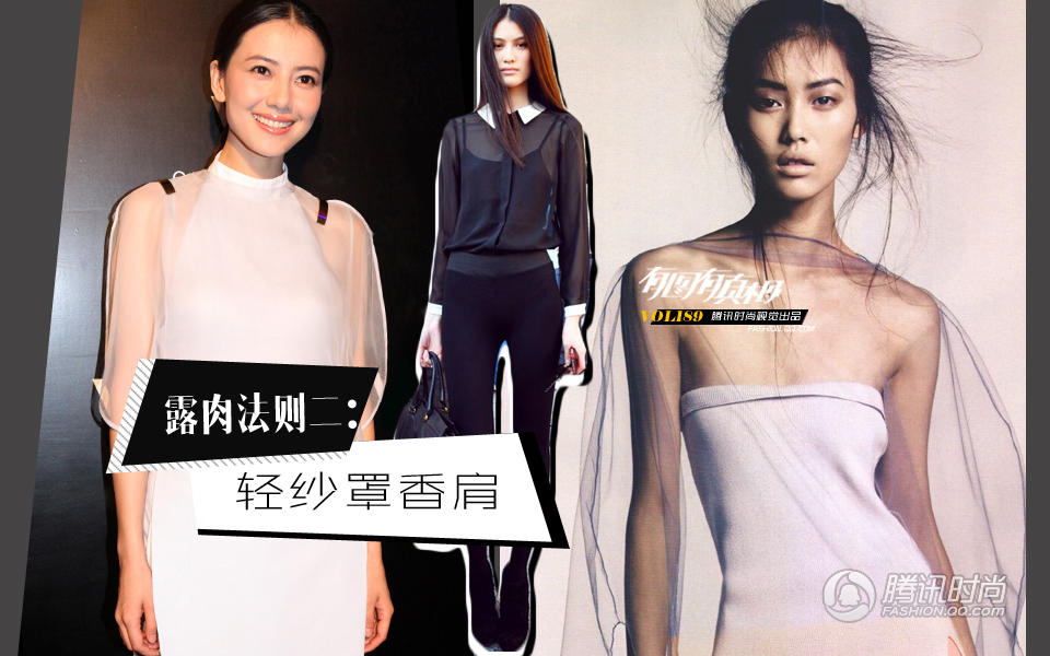 还在犹豫要不要露胳膊露腿,那就先别玩那么大,从薄纱罩衫秀美肌开始迈出性感第一步吧。直以来走清纯路线的高圆圆这身白色长裙原本只是一款无功无过的装扮,却因外披的白纱罩衫立即显出了层次感,同时于她的纯净形象也丝毫无损,可见女神永远赢在细节。超模刘雯向来是穿衣之道的传道人,白色打底衫风格硬朗,同色的薄纱外套显得暧昧飘逸,让人赏心悦目。中国另一位国际超模何穗向来以兼具古典与时尚的穿衣风格为人称道,在这张街拍中她在偏中性的英伦风薄纱衬衣里以一件简简单单的黑色背心打底,配上黑色紧身裤和短靴可以说性感得隐晦又高贵。