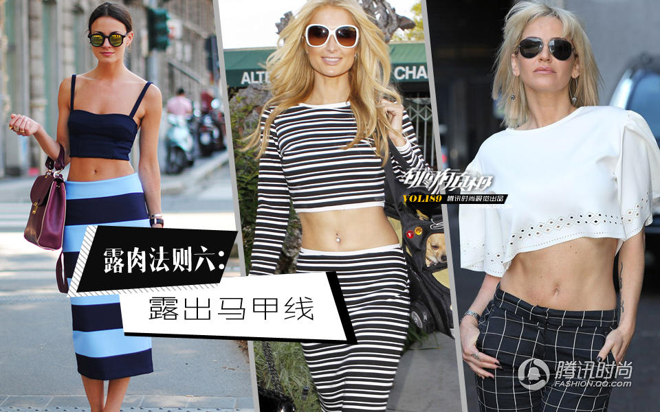 今夏,一直很特别的露腰装又重新受到了大咖们的关注。从呛女孩组合单飞后的莎拉-哈丁穿衣更加麻辣,带镂空印花边的露腰短袖将小腹迷人的马甲线狠秀了一遍。在穿衣上从不含糊的希尔顿露起马甲线来也是有模有样,套装是永不出错的选择,条纹带点随意又带点复古,是很经典的元素。在2013春夏米兰时装周的街拍中,一位时尚潮人身穿深蓝色吊带平口露脐背心搭配同色系的条纹长裙,贴身露肉的服装展现了她迷人的腰线和现今风靡的马甲线,试问有这样身材的美眉们你们有不露的理由么?