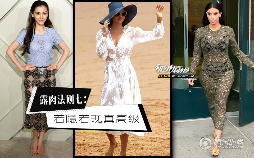 有选择恐惧症不知道露哪里的姑娘们不用再纠结了,因为全身都露已经成了今夏的又一潮流。维秘超模米兰达可儿在澳大利亚度假期间她被狗仔拍到一袭白色蕾丝透视裙海边漫步,仙气无比的白色蕾丝配上米兰达特有的柔美笑容真是性感得甜蜜蜜。而婚期将至的金卡戴珊的这套墨绿色镂空复古长裙搭配黑色内衣则是秀性感还不忘顾及高雅,看起来心态上也在向端庄时尚的人妻靠近。Angela Baby这套透视装从头露到脚,然而透视加大印花蕾丝的搭配则让整体显得气场十足,可以称得上是清凉夏天穿出大牌气质的绝佳选择。