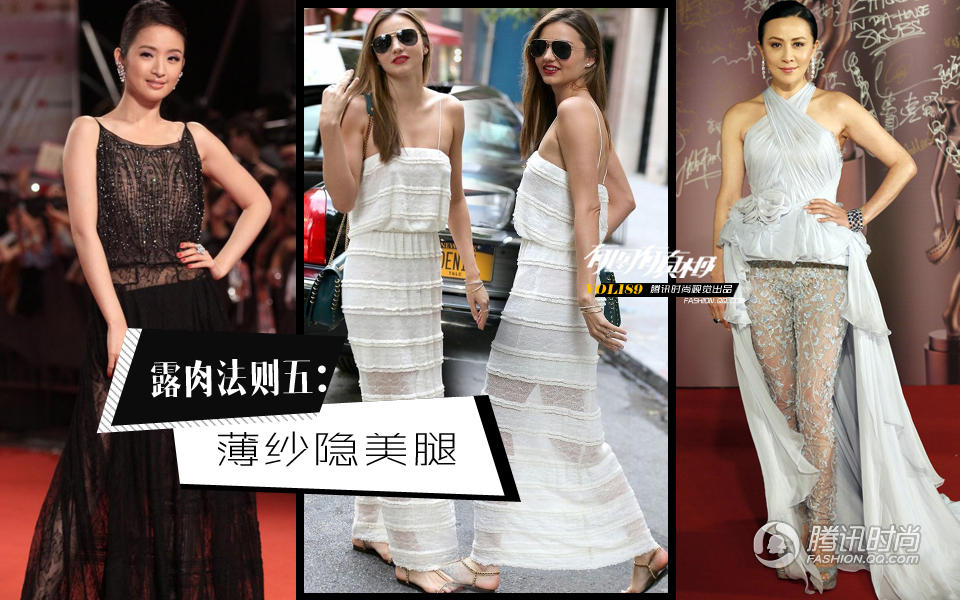 不同于坦胸露背的张扬,露腿向来都是低调又很有气质的性感方式。米兰达可儿在纽约街头的这组街拍以飘逸清新的白色吊带裹胸透视长裙让美腿若隐若现,再配以亮金色的平底夹脚凉鞋将看客目光锁定在腿部。而同样露腿抢镜成功的还有在金钟奖上再度封视后的林依晨,不同于一贯的少男杀手形象,她这次现身穿的这条黑色透视长裙充满熟女的优雅和妩媚让人眼前一亮。被指出道以来“从头到脚没有一处不曾走光”的刘嘉玲在刚刚结束的金像奖上的那套Ralph&Russo透视长裙,则以闪亮蕾丝将裙和裤完美结合,既柔美飘逸又不失力压群芳的气场。