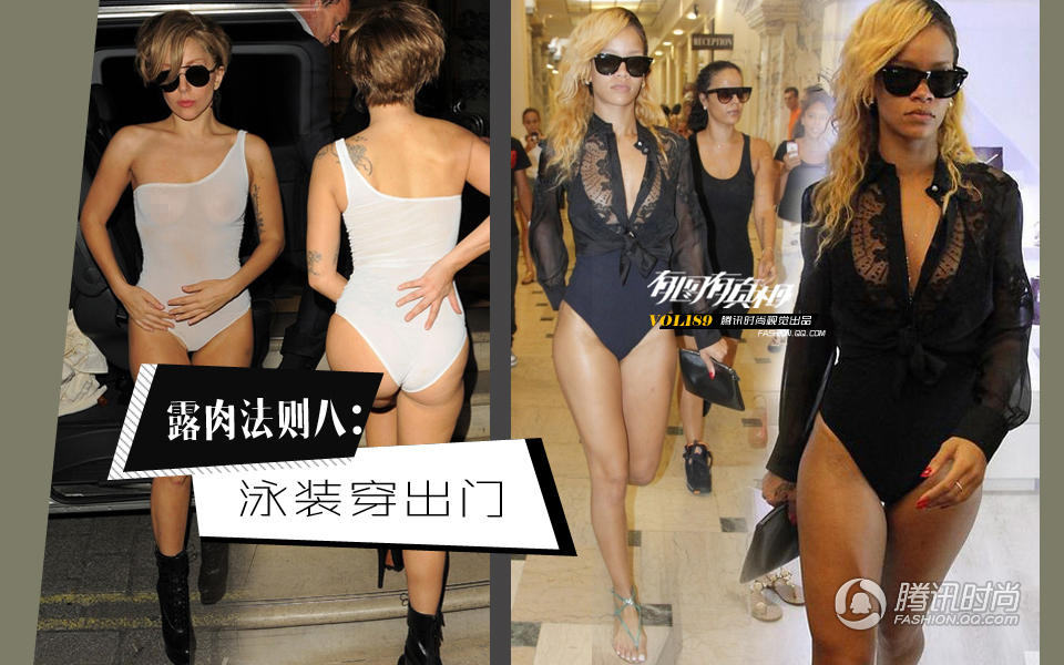 玩出位就要有创意,这不,蕾哈娜和Laday Gaga这两位时尚圈的怪胎就另辟蹊径地直接泳装出街了。蕾哈娜在摩纳哥逛街时穿的这套泳装性感地胸和腿一起露,让旁观路人大饱眼福。而看似随意地搭在外面的透明薄纱衬衣则让衣着迅速有了潮的气息。与此相比,Lady Gaga的泳衣亮相就更加张扬了,穿着纱质泳衣还敢直接真空上阵的她真是完美诠释了什么叫没胆子就别想潮。黑色短靴既强化了朋克酷感更拉长了腿部线条,真是值得点赞的一身行头。
