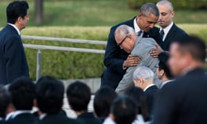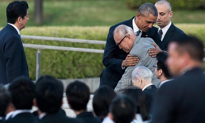 US President Barack Obama hugs Mori Shigeaki, a survivor of the atomic bombing of Hir