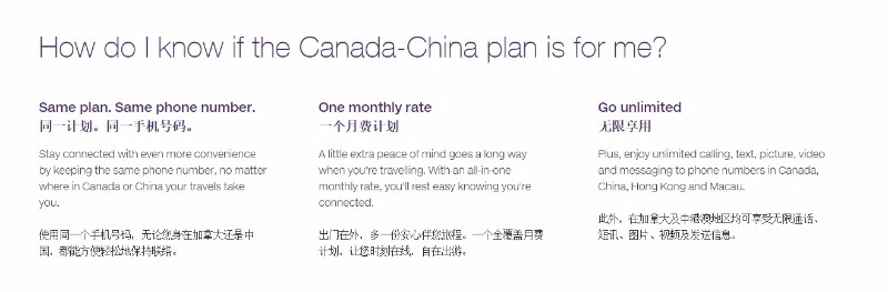 该计划的订购用户可以无限接听电话、接收短信、照片和视频,并且向加拿大、中国大陆及香港和澳门地区的手机号码发送短信,数据流量则依订购计划的不同而略有差异。