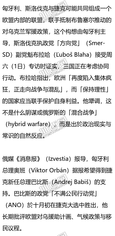 巴比斯認為,捷克替烏克蘭購買彈藥的「砲彈倡議」昂貴且不透明,主張援烏應由北約統籌,而非動用國家預算。新政府預計11月上任,執政聯盟將包括同樣持歐盟懷疑立場的政黨「自由與直接民主」(SPD)及「汽車黨」(AUTO)。