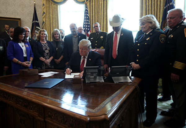 川普总统周五在白宫椭圆形办公室签字否决国会通过的这项议案,在场见证川普首次动用否决权的人士包括副总统彭斯、遭非法移民杀害的受害者家属、海关和边境保护局(CBP)的官员、司法部部长威廉·巴尔(WilliamBarr),以及与国土安全部部长尼尔森(Kirstjen Nielsen)。