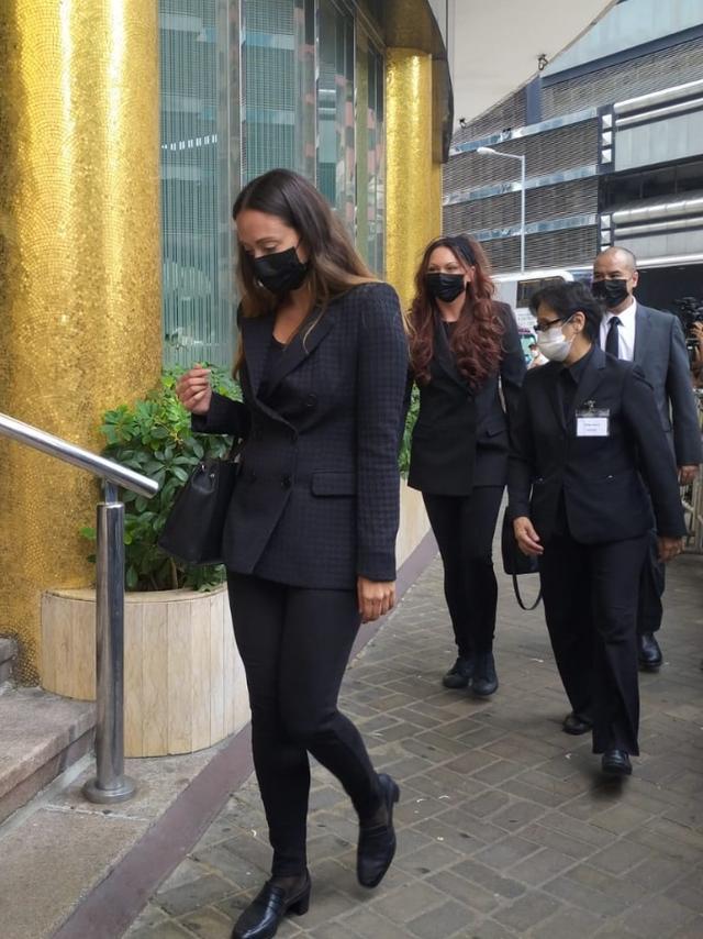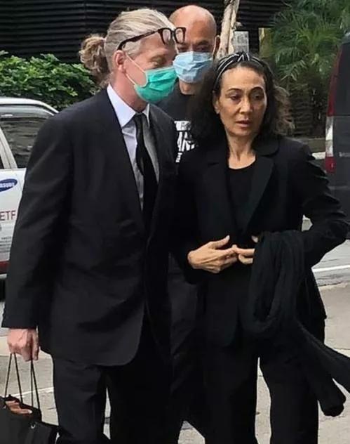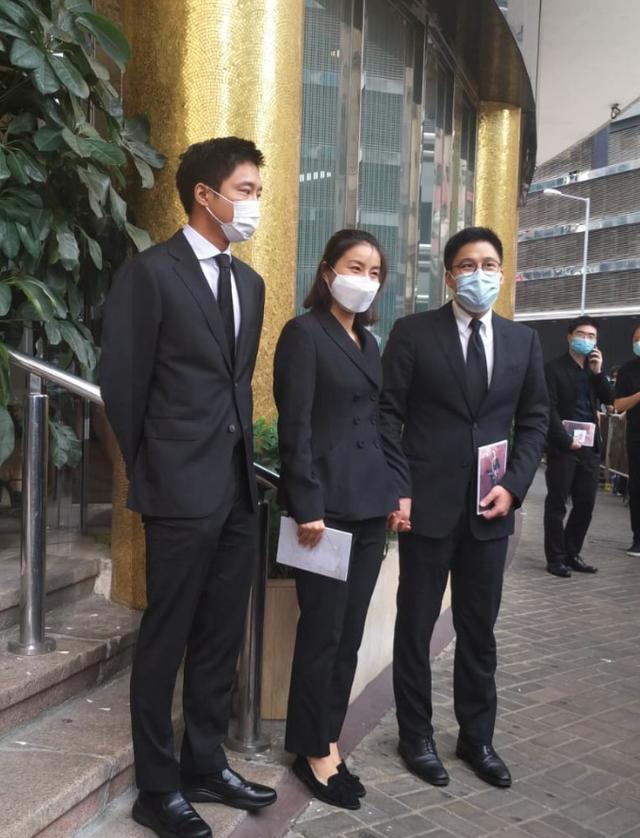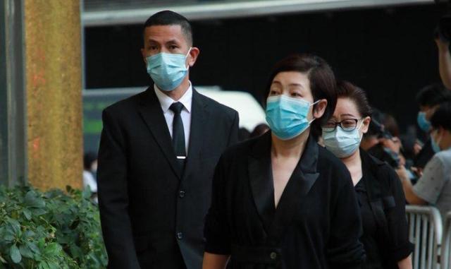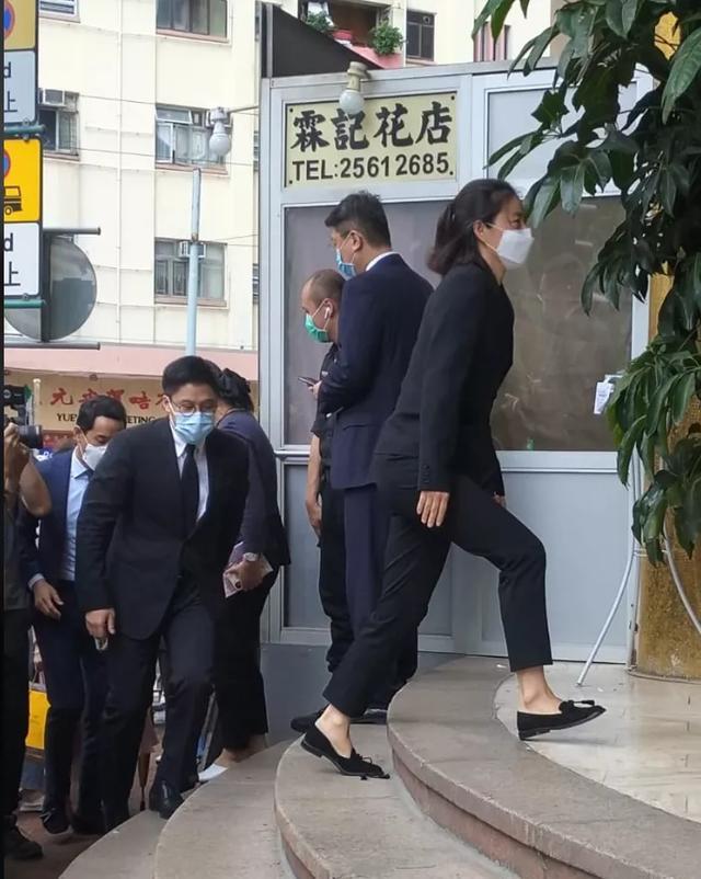 霍啟剛夫婦則是一身黑衣登場,霍啟剛跟在郭晶晶後面好男人意味頗濃,而郭晶晶打扮格外樸素,黑西裝配簡單馬尾和平底鞋上陣。