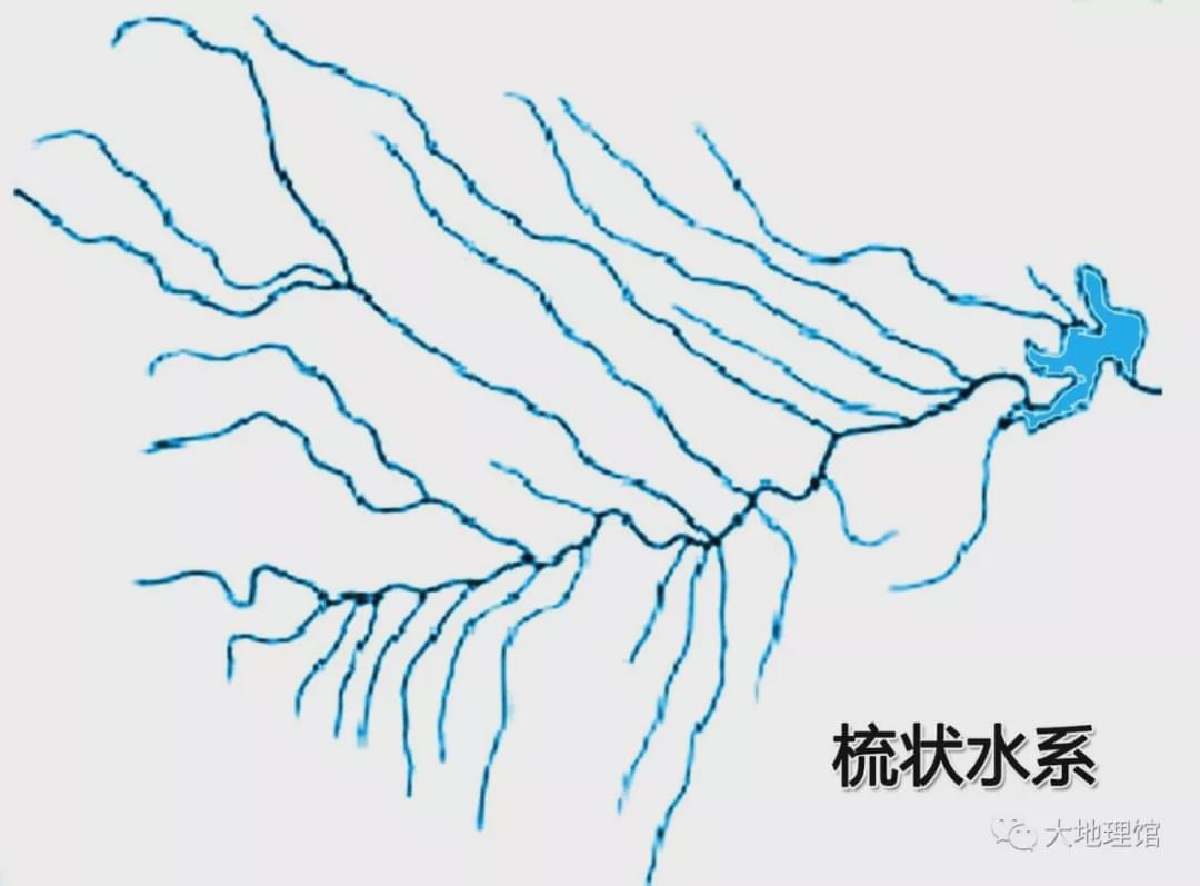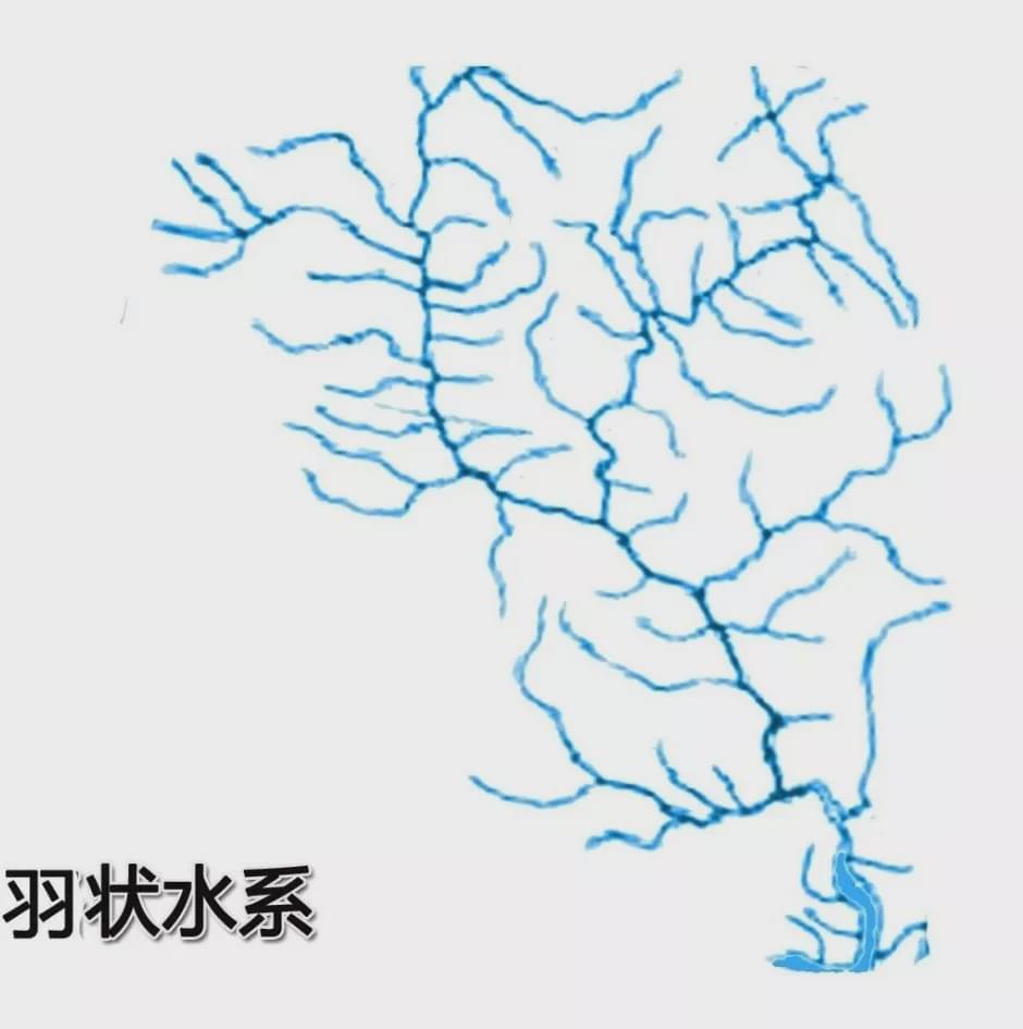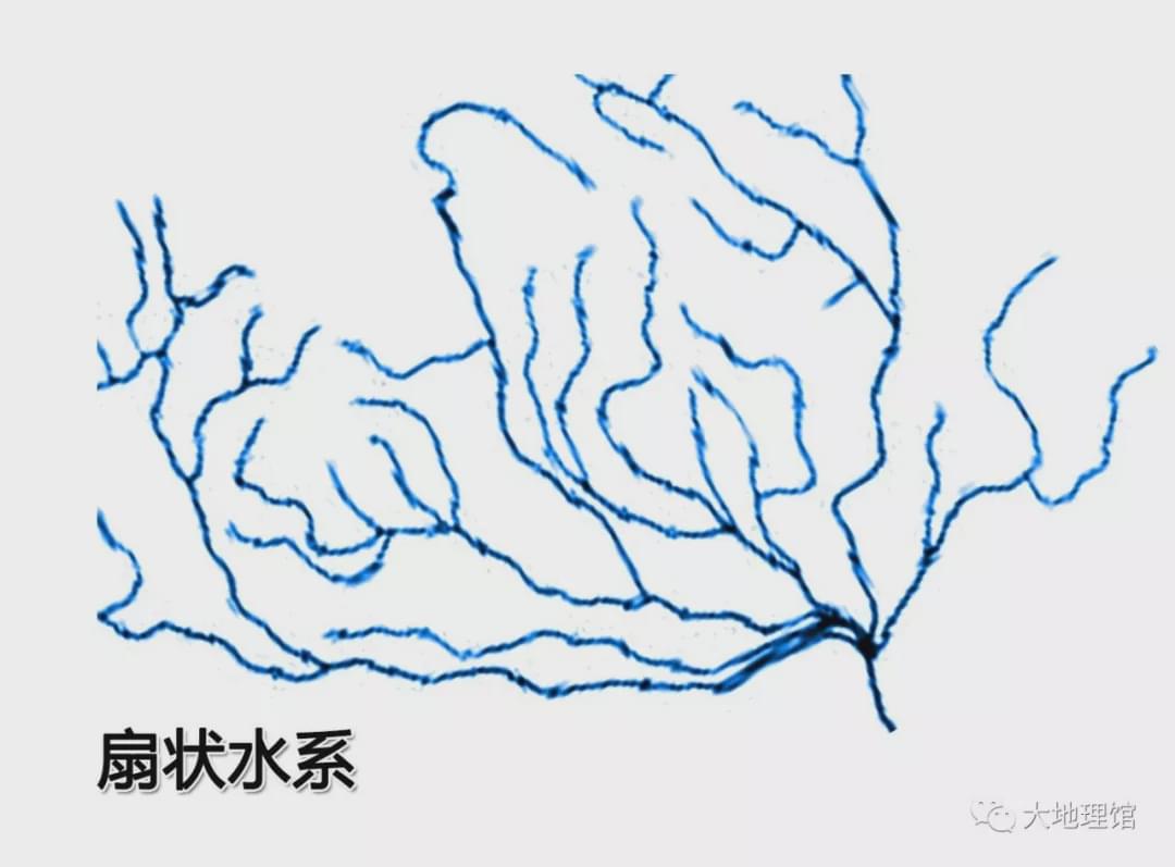 分別對應扇形、羽狀、枝狀水系