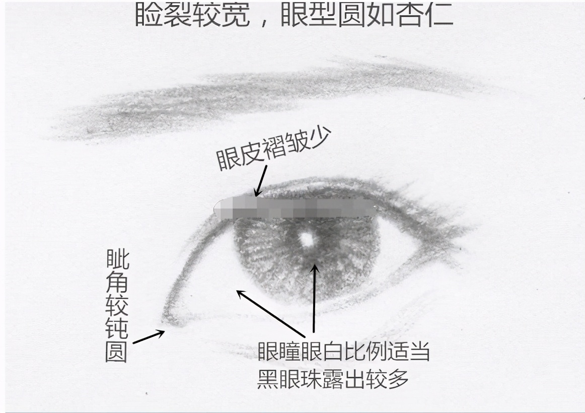 相對於丹鳳眼和狐狸眼而言,外眥角較鈍圓,也不像桃花眼和丹鳳眼的眼尾那麼長,眼黑比例占得較多,眼皮褶皺少,杏眼的上眼瞼多為小雙眼皮或者內雙,眼神看起來明亮清澈。