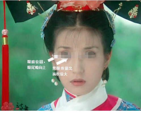 可以看出她眼睛的上眼瞼最高點在整個眼睛的內三分之一處,下眼瞼的最低點在整個眼睛的外三分之一處。內眥看起來像在上瞼內側瞼緣上加重了一筆,加重的線條向著鼻翼方向,顯得五官更加嫵媚。
