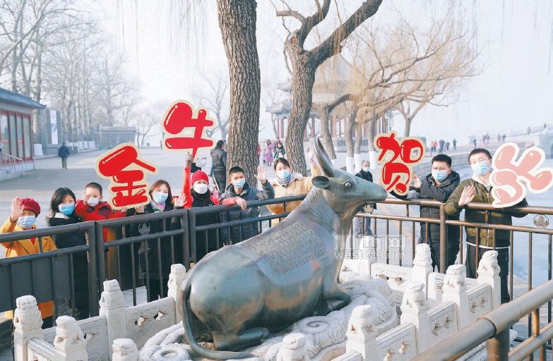 牛年大年初一,京城不少游客来到颐和园,和铜牛合影,希冀牛年“牛气冲天”。颐和园铜牛现存于昆明湖东堤岸边、廓如亭北,牛头面朝西北,两角直立,体态与真牛相似。