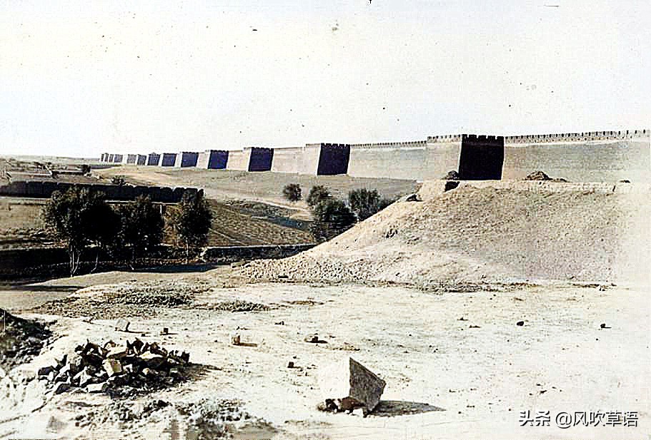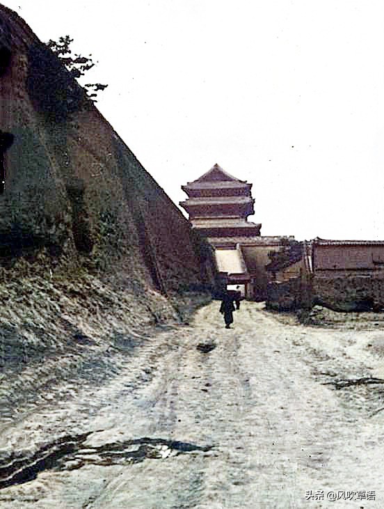 高大的城牆,把行人顯得特別矮小。 城外的黃土道路有些坑窪不平,前面不遠處是高大巍峨的城門樓。