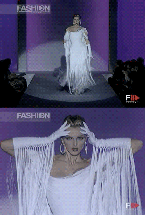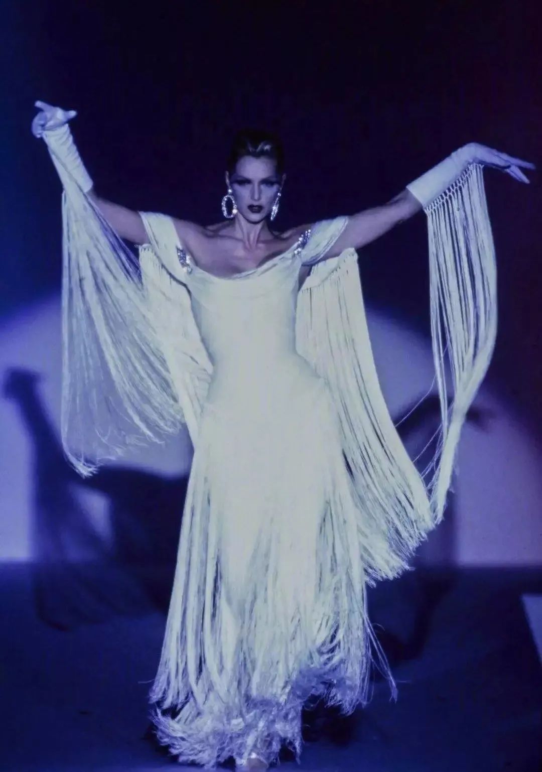 第一套Thierry Muglar1998秋冬“古着”高定,设计灵感或许来自于桑德罗·波提切利的《维纳斯的诞生》,少女维纳斯的眼泪化作珍珠,告诉世人美是自我完成,是不生不灭的永恒。