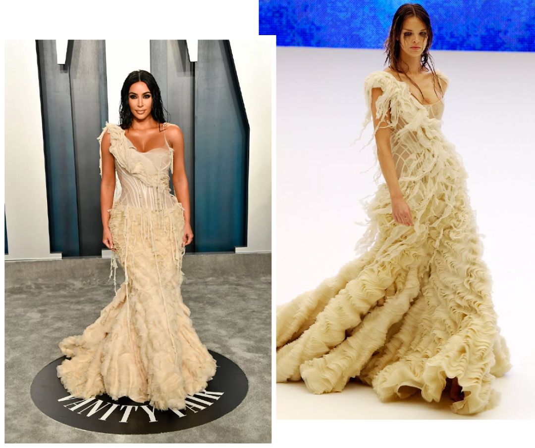 走同一场红毯的还有卡戴珊,馆藏级别的古着礼服来自 Alexander McQueen 2003 春夏系列的 "牡蛎裙"。整条裙子由上百层的欧根纱制成,用破败的美感来展现当季“沉船”的主题,好看到昕小薇立刻想去回顾03年这场秀。Kim Kardashian in McQueen 2003