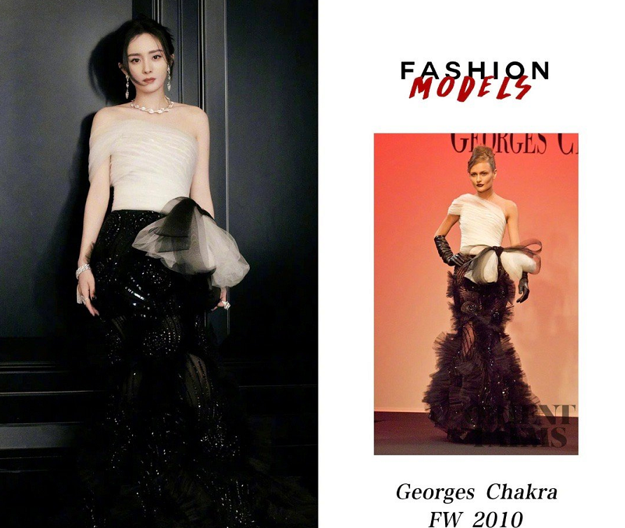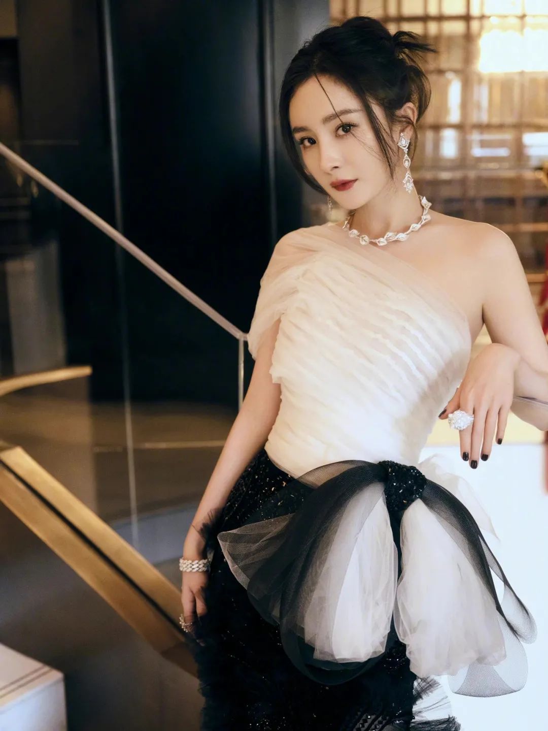 杨幂当天一条黑白拼接款抹胸礼服裙,薄纱材质点缀星星点点的亮片,吸睛且高级,这件礼服很扬长避短,下摆半透视的鱼尾纱超级美。