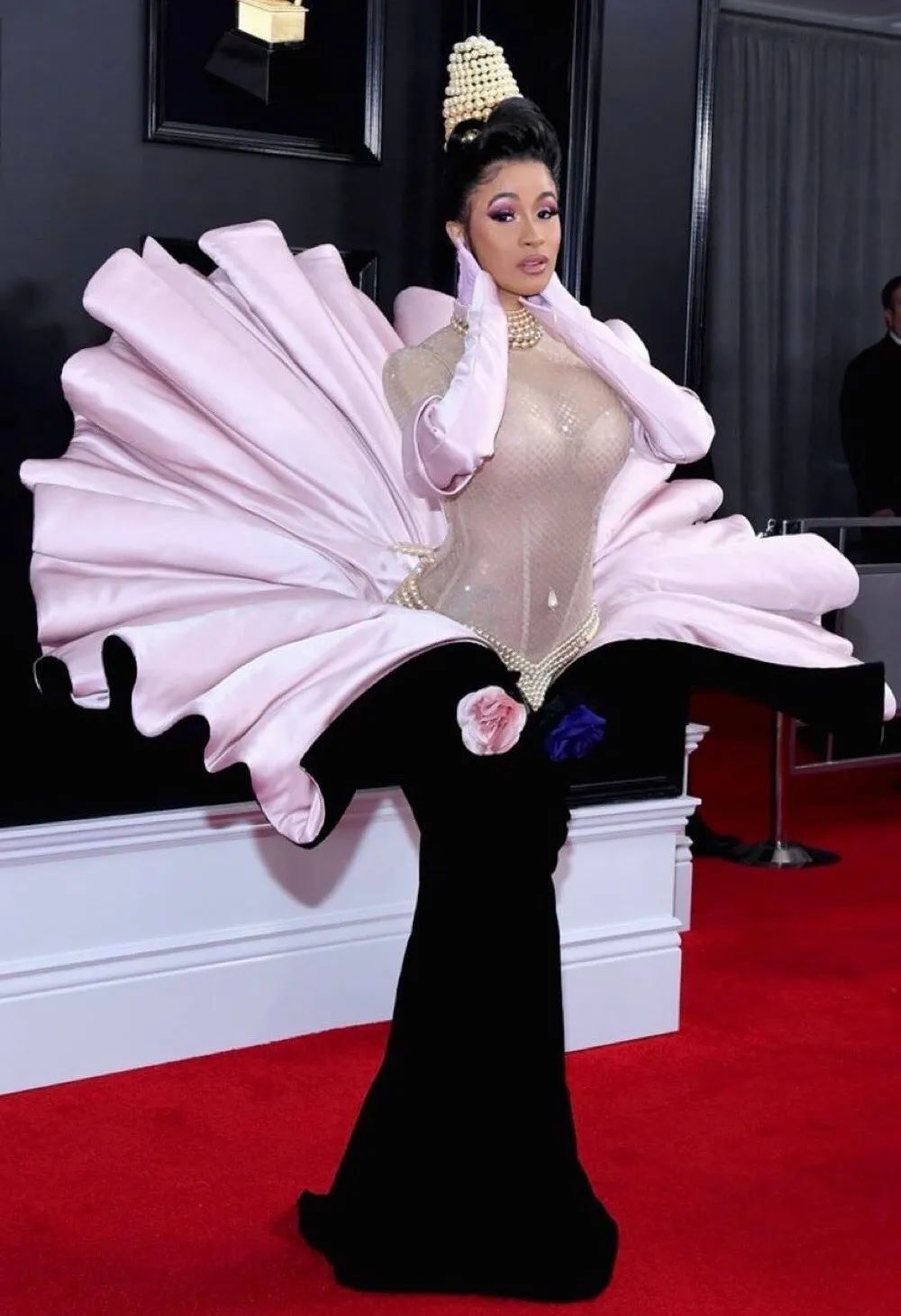 纯白色简约的设计搭配自然垂坠的流苏,Cardi B化身“暗夜精灵”,从此红毯上还有谁是卡姐的对手。