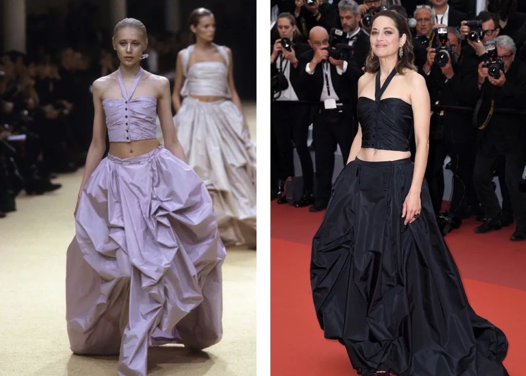2019戛纳电影节首映红毯,法国女星 Marion Cotillard 也选择穿着了一款旧款的 Chanel 高级定制服。