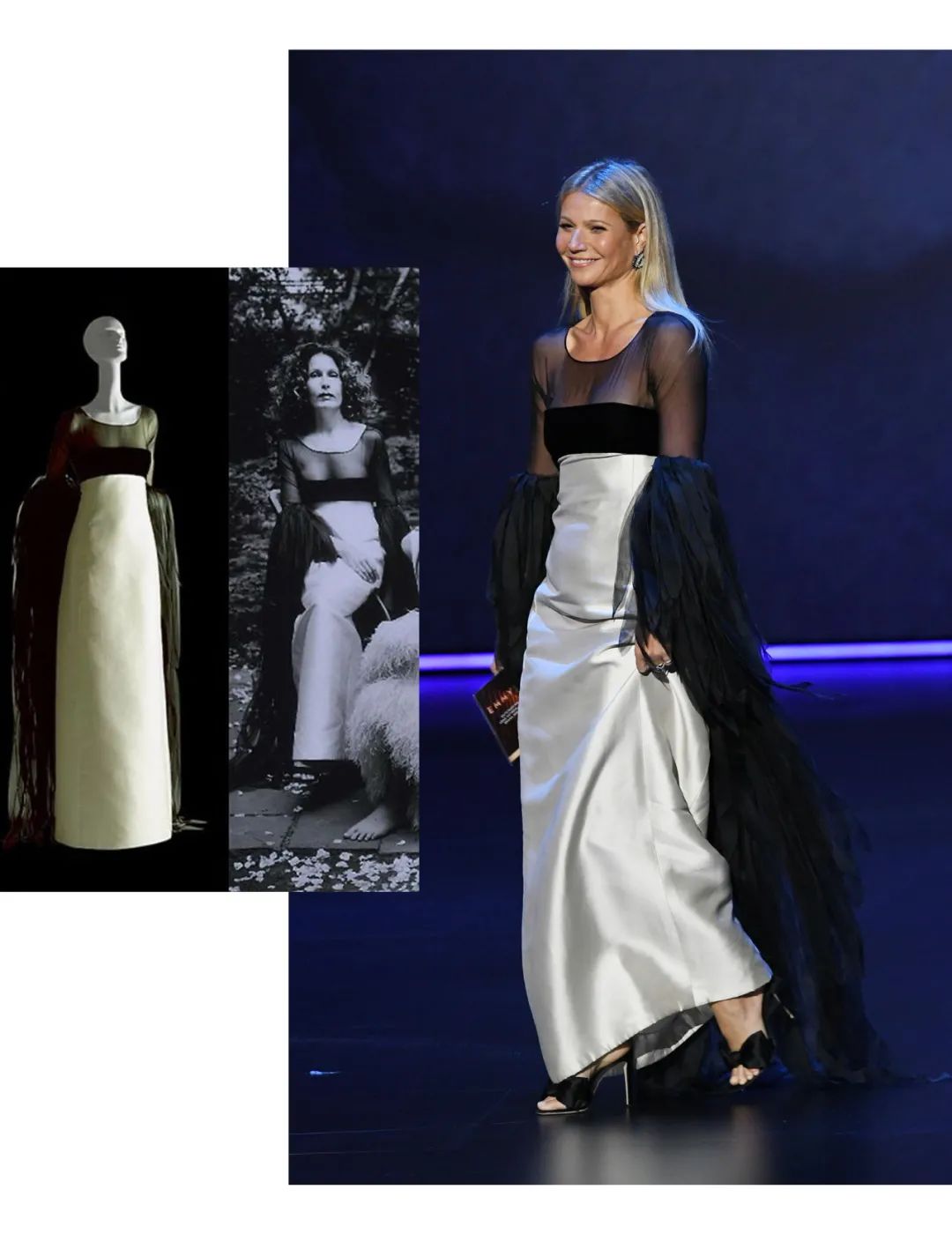 Gwyneth Paltrow出席2019年艾美奖颁奖典礼,身穿Valentino的1963高定系列,上身的透明细节,袖子上黑色欧根纱细节宛如羽毛,虽是单色裙却足够丰富精彩。