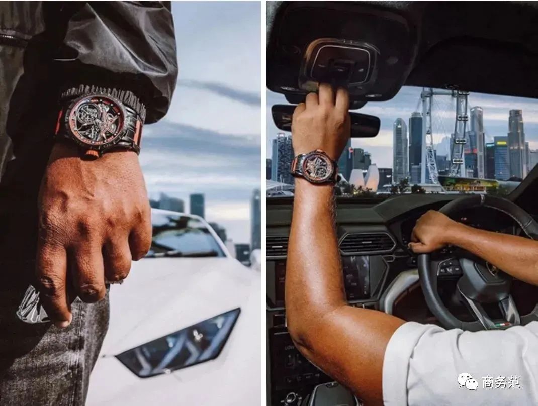 他還用羅傑杜彼王者系列腕表配搭配蘭博基尼跑車,運動又酷炫。