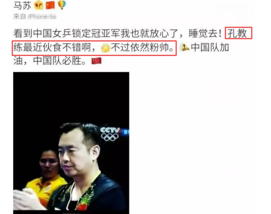 2016年8月10日,李曉霞和丁寧在裡約奧運會上同時晉級乒乓球女單決賽,馬蘇發微博提前恭喜中國隊奪得冠亞軍,還順帶調侃孔令輝“最近伙食不錯,不過依然粉帥。”