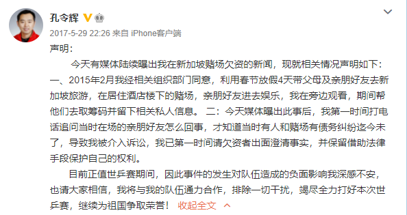 盡管當晚孔令輝就發表聲明,澄清自己並未參與賭博,親朋好友進去玩了,自己只是在旁邊觀看。