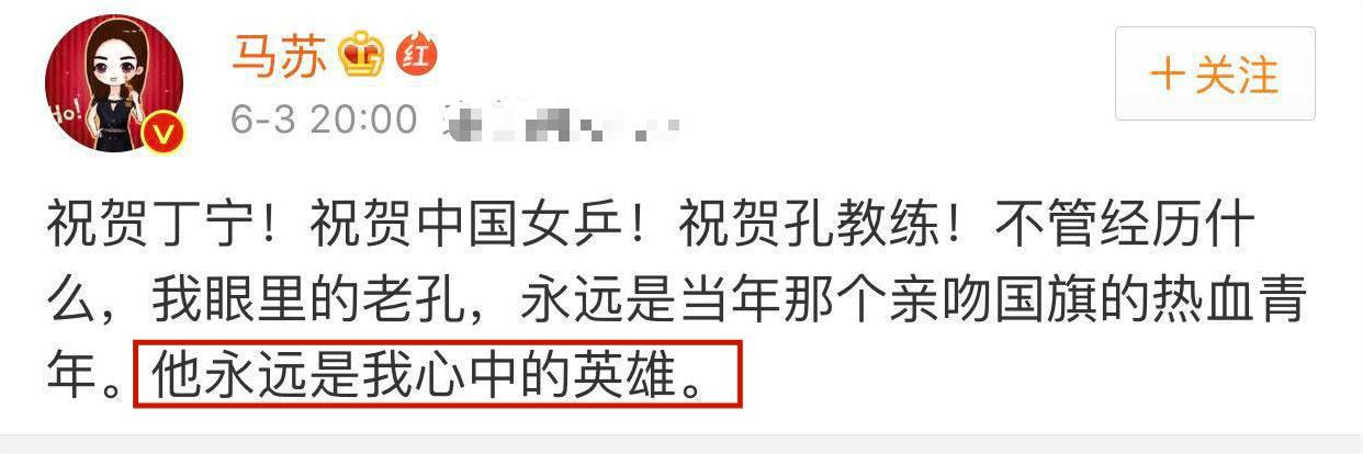2017年,孔令輝被爆賭博欠債,就有不少人猜測馬蘇和孔令輝分手就是忍受不了他賭博,但是馬蘇隨即發文力挺孔令輝。