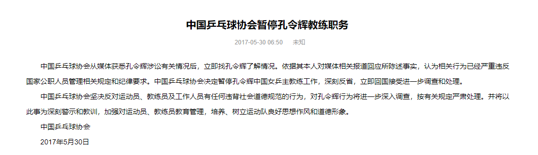 但孔令輝第二天就被暫停了女隊主教練工作,並被要求立刻回國接受調查和處理。