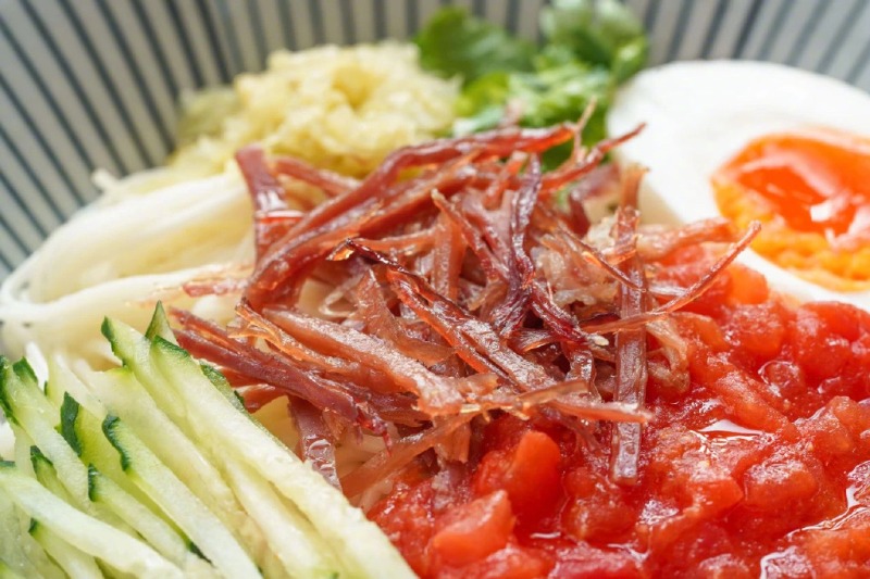 ▪️面条煮熟,过冰水,铺黄瓜丝火腿丝(还可自行加点香菜和泡椒),淋上第一步的酱汁和炒好的番茄,再挤点青柠檬汁,拌匀,趁凉吃!