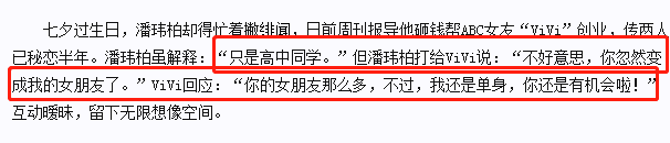去年7月,潘玮柏突然在网上公布自己已婚的消息,而他的妻子就是前几年与他传过绯闻的luna。一般来说,明星官宣这种喜讯,总能得到不少祝福。然而,在潘玮柏这里,就像“翻车”了一样,许多清一色的不看好言论。最有趣的是,王思聪还直接点名说luna就是“天王嫂培训班”的人。一时间议论纷纷,许多人纷纷表态憨憨潘玮柏被“PUA”了,言外之意则是他被骗了。事实上,在情场中周旋多年的潘帅可没那么容易被骗。刚上小学六年级的潘玮柏就已经情窦初开,对某位七年级学姐一见钟情,两人经常打电话,还会一起听张学友的《吻别》。较为早熟的他,14岁便把初吻给了一个年长他2岁的学姐。有意思的是,他并不认为双方有了这种举动以后,就算正式恋爱了。因为他曾在节目中说过自己的初恋是个日本女生,但有过“初吻之亲”的学姐并不是外国人。不过,小小年纪就有几段情史的潘玮柏,依旧没有逃过初恋被甩的命运。此后,潘玮柏正式开启了自己的“恋爱之旅”。蔡康永曾问他谈过几任女友,他没有正面回应具体数量,而是直言自己交往过至少8个国籍的女友。进入娱乐圈后,潘玮柏的风流情史和以往比起来,更是“丰富多彩”。2004年,他和张韶涵共同合作了《快乐崇拜》,名声大噪之时,关于两人的暧昧消息也是甚嚣尘土。比如张韶涵曾在节目中坦言“我蛮喜欢潘玮柏”,男方也疑似高调回应选女友会找张韶涵。还有他们和周杰伦一起参加活动时,张韶涵在衣服上画了一枚钻石,主持人问及是否想要出嫁?张韶涵没有立刻回应,周杰伦却直接回答说:“去问潘玮柏啊”。此外,张韶涵也曾公开表明自己可以考虑“姐弟恋”。并且,在被采访到母亲感情时,她是闭口不谈的状态,却大方表态了潘玮柏一事。你以为到这里就结束了?不,这只是开始。即便潘玮柏和张韶涵的绯闻传得沸沸扬扬,中间也穿插过一次“潘玮柏和Selina接吻事件”。大致经过便是:潘玮柏和Selina一起拍广告,但是被Ella疯狂吐槽两个人背着镜头,无需接吻,结果吻上了。只是当时大部分cp粉都在磕潘玮柏和张韶涵,所以吃瓜群众对此并不感冒。唯一让人有点“意难平”的,或许就是突然有媒体曝出潘玮柏和张韶涵秘密分手的消息。这件事的真实性虽然有待商榷,但自此以后两人确实鲜少有过同台合作。虽然网传两人关系be了,但是潘玮柏的风流史却没中断过。2009年,有媒体拍到潘玮柏和蔡依林一起出街吃冰,还示意不排斥交往,他俩的关系也一度陷入“扑朔迷离”之中。网友还没来得及捋清楚这两人的关系,卓文萱又站出来对潘玮柏公开喊话:“希望你可以找我做钟点情人”。次年,潘玮柏在拍摄电视剧《爱无限》时,又主动透露自己对女主张榕容比较来电。2011年,“万花丛中过”的潘帅又被拍到和周杰伦的MV女郎江语晨的亲密同行照,引人遐想。或许是绯闻太多,刚被爆出他有新任女友ViVi时,他便急着站出来解释两人只是同学。然而,两人的对话却有点“捉摸不透”。潘玮柏刚对ViVi说完:“不好意思,你忽然成为我的女朋友了”。ViVi连忙接着说:“你女朋友那么多,不过我还是单身,你也有机会”。此番话语,带有暧昧气息的同时,似乎也间接透露出了潘玮柏的“恋爱状况”。在这之后,潘玮柏的绯闻女友又转变成了名门千金杨馥瑜,即便被拍到一起参加了婚礼,潘玮柏也表明两人只是朋友。再往后面推算一下,可能就是他和吴昕这对“无尾熊cp”了,不过他俩也没真正走到最后。细算下来,混迹娱乐圈多年的潘帅,确实很少在公众面前展现自己的“感情”。然而,看似十分低调的他“花边新闻”却从未断过,实在令人唏嘘不已。 -