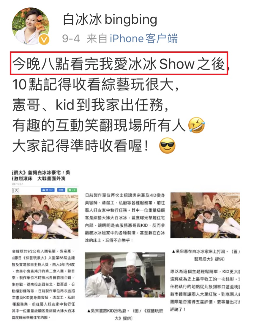 如今,白冰冰的“我愛冰冰show”綜藝依然在播。老一輩的藝人,比很多觀眾的父母輩年紀都大了,早已不復昨日光鮮,台灣綜藝也今非昔比,但她不改初心,還不忘在社交平台上為節目做宣傳。