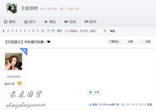 9月21日,王祖贤在贴吧发文祝粉丝们“中秋节快乐”,虽然只有短短的五个字,却引来众多网友的跟帖回复,“姐姐中秋节快乐!”“姐姐好想你。”“每逢佳节倍思亲,希望祖贤姐在遥远的加拿大一切安好。”“姐姐会复出吗?”