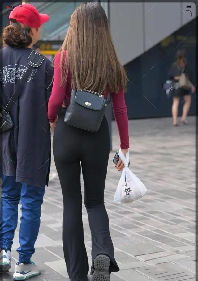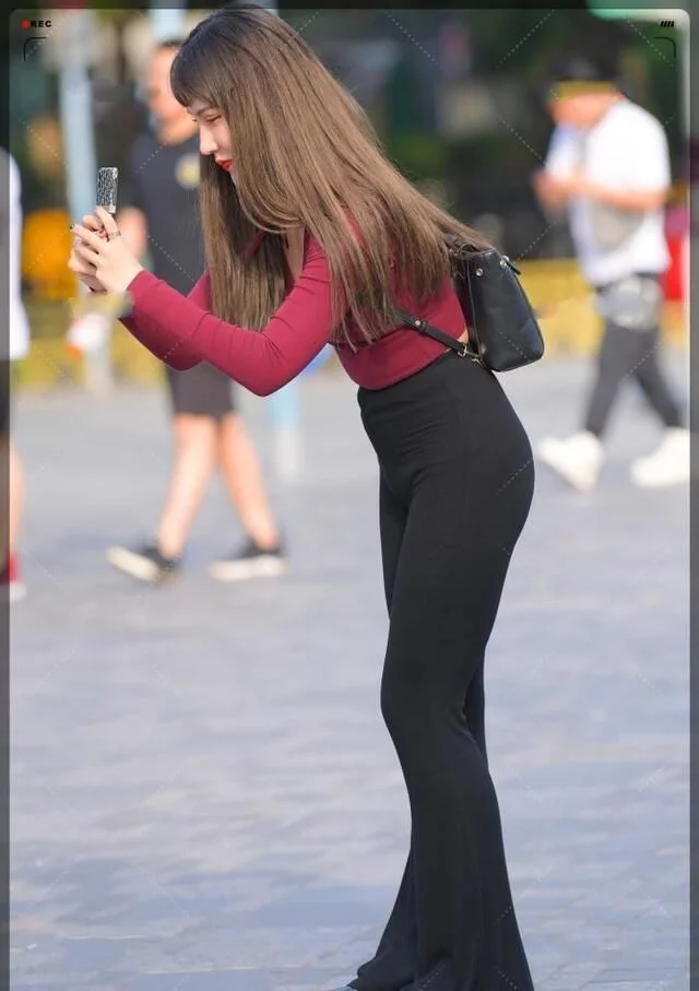 这位姑娘上身配色是酒红色贴身上衣,小衣服和高腰喇叭裤正好连接,高腰裤子把小肚子收紧盖住,整体看起来小蛮腰轻轻松松,怎么看都好看,分分钟穿出模特大长腿的效果,又不乏单调,配色也是很搭的。