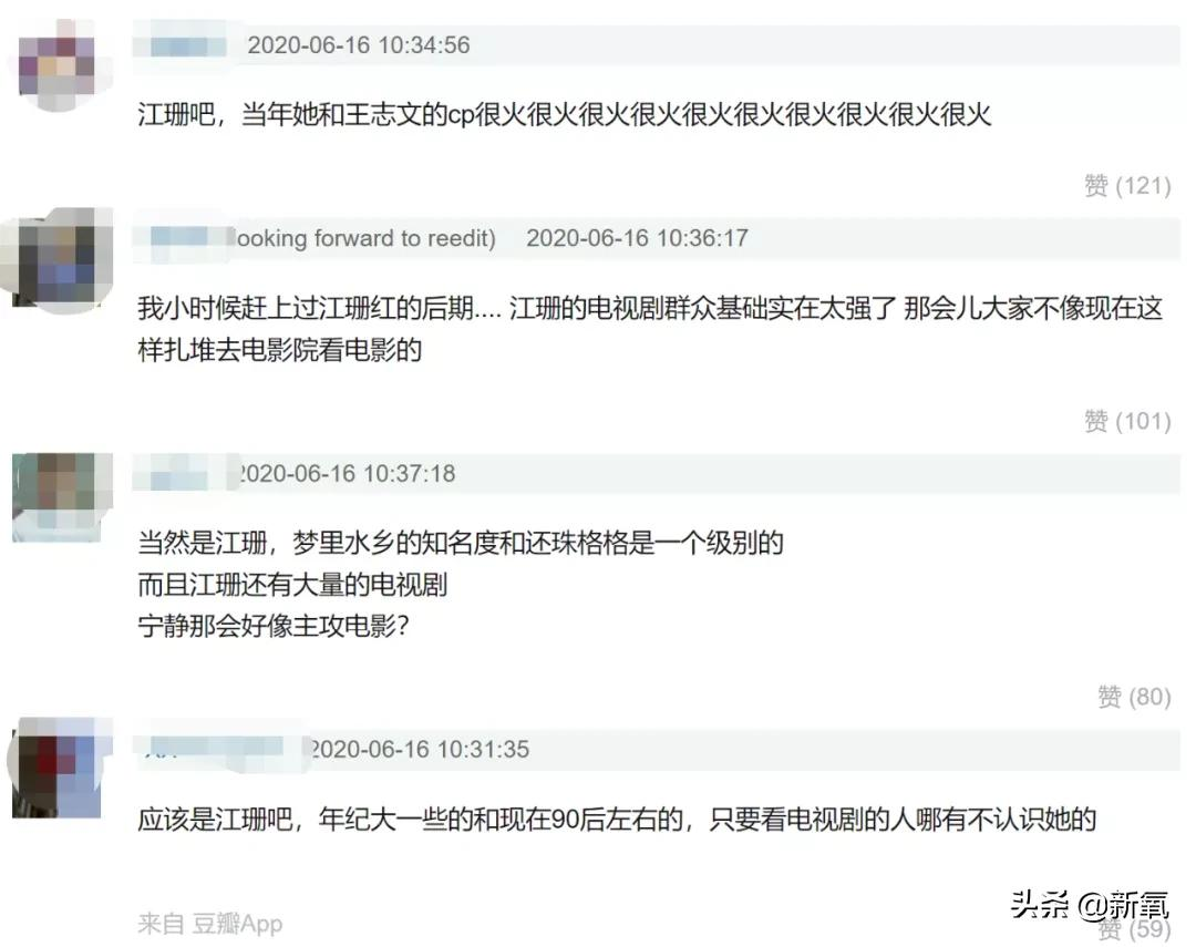 一提到90s美人,许多人都会想到港台辉煌时期的“霞玉芳红”。殊不知,内地也不少风格各异的美人,而江珊则是其中之一。如今的大部分网友或许对这个名字没什么印象,但她可是90年代名副其实的“真·顶流”。江珊1994年,赵宝刚的成名作——《过把瘾》一举推出,万人空巷,其火爆程度不亚于后来的《还珠》。主演江珊、王志文成了现象级“国民CP”,江珊凭此迅速跻身电视剧界一线花旦行列。《过把瘾》在豆瓣的90年代“国民一姐”之争中,江珊更力压宁静、张凯丽、陈小艺等人,成为TOP,足以见其国民地位与好感度。豆瓣评论在《过把瘾》中,江珊把那个任性、自我的可爱小女人“杜梅”演绎得鲜活明亮,加上其本身颇富“男人缘”的长相、气质,俘获了万千国人心,成为90年代的“大众情人”,父母辈的青春记忆。据说,当时的街上随处可见江珊的海报、发型及歌曲《梦里水乡》。“几乎全国男生当时都暗恋过江珊”。这句话不是空穴来风。汪涵也曾公开表白:“江珊一直是我的女神,看到她我就会脸红。面对江珊的美,仿佛世间的一切都可以被原谅。”