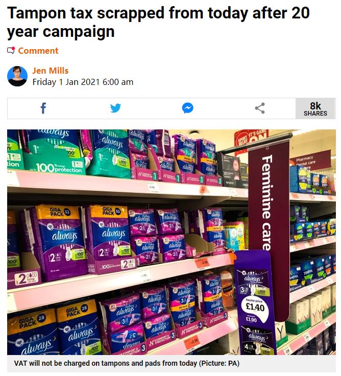 而从今年1月1日起,英国取消了对月经用品征收的5%增值税。