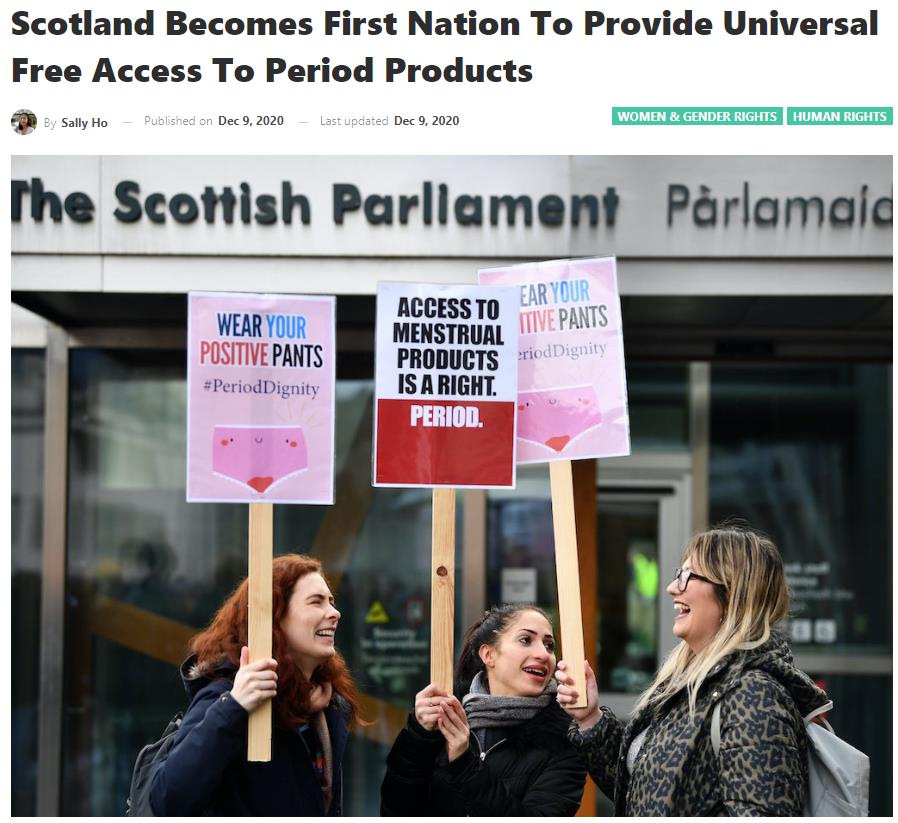 去年11月,苏格兰公投通过了为所有需要的人群,免费提供经期用品的法案。