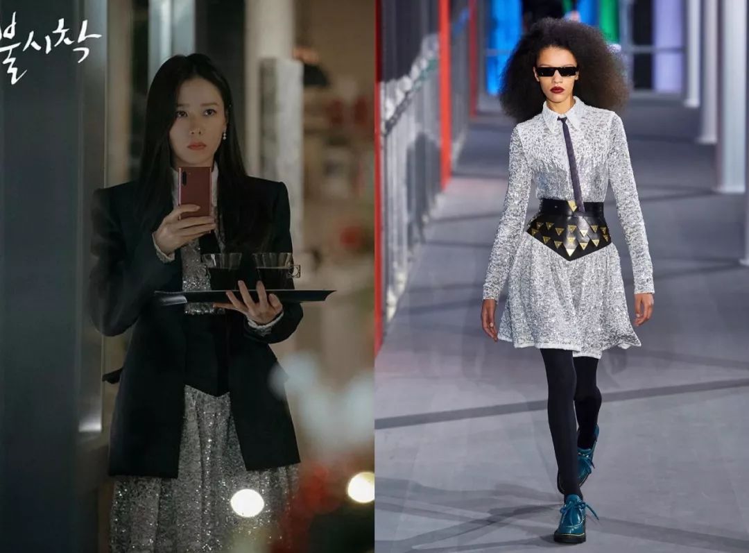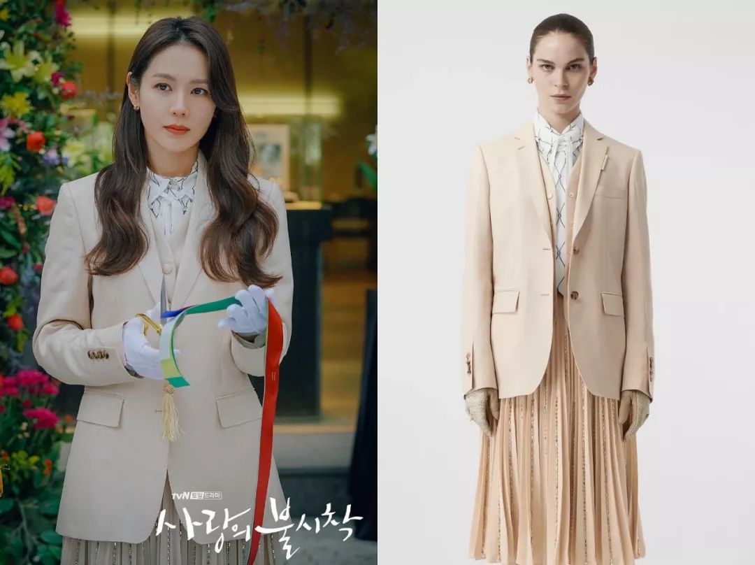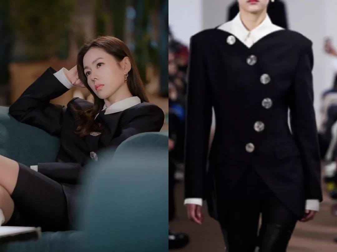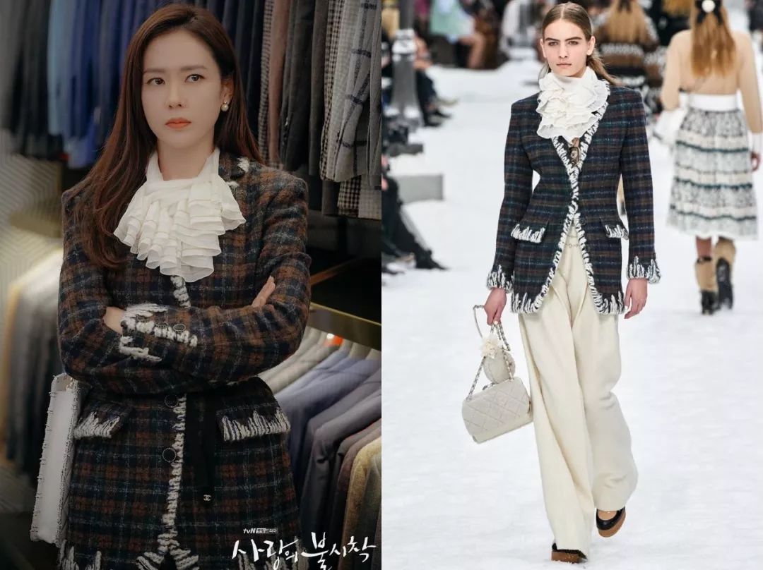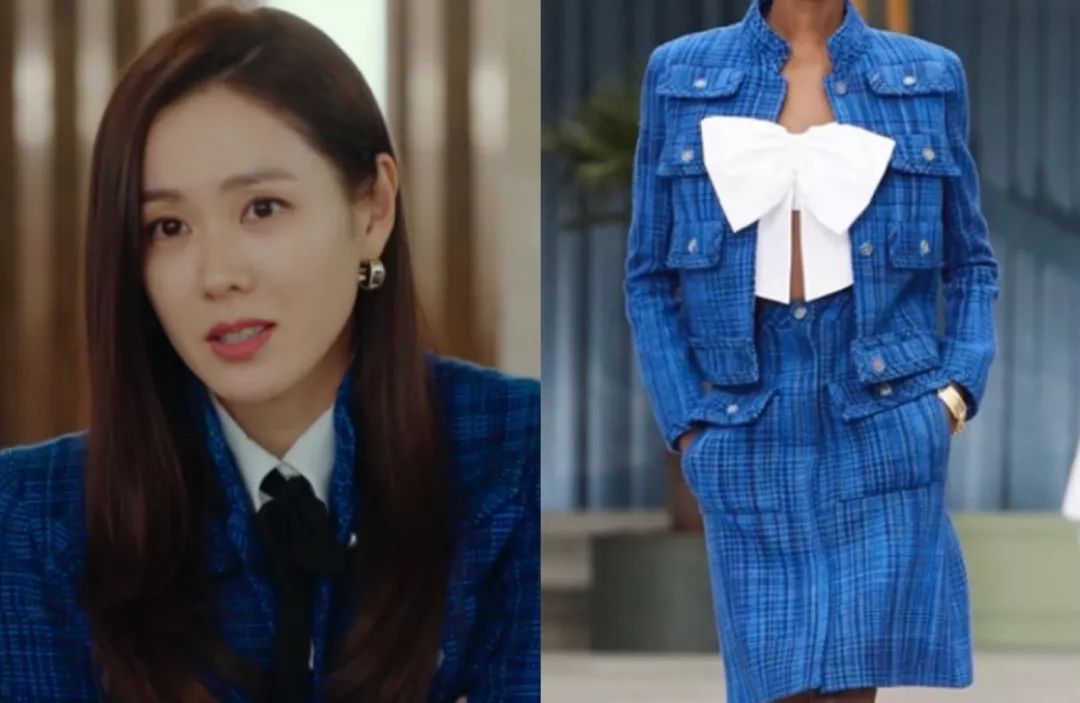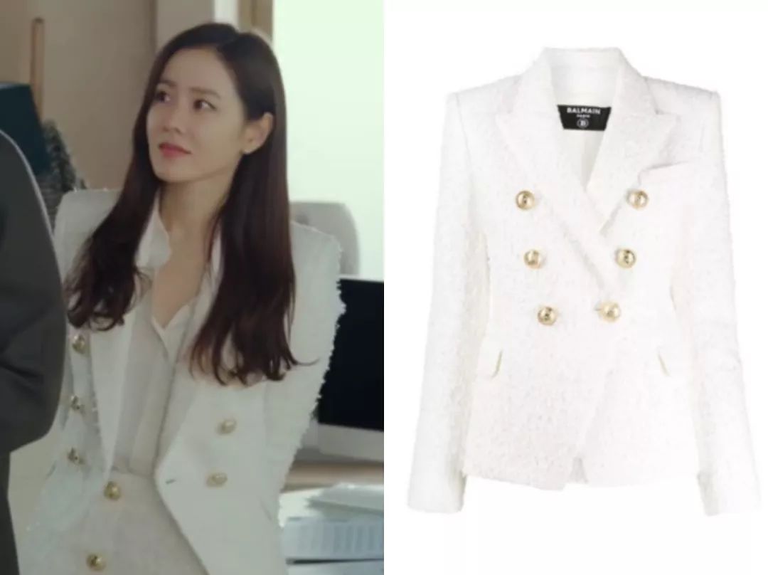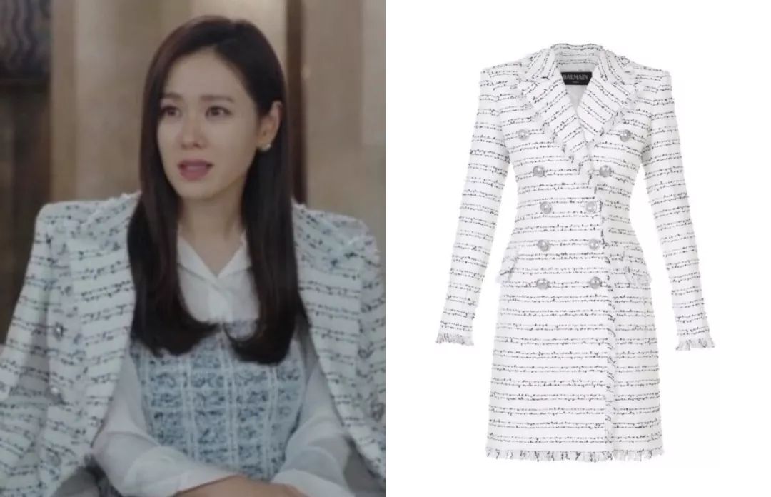 华丽宫廷风孙艺珍扮演的尹世莉,平时穿的最多的,要数各种华丽名媛风的衣服,她很喜欢宫廷风元素,像是垫肩、钉珠、粗花呢套装,既贵气又抢眼,很符合女主财阀千金的人设。比如这件斜纹软呢外套,就来自CHANEL 2019秋冬秀场,搭配同系列雪纺衬衫,一看就是有钱小姐姐↓这件宝蓝色的来自CHANEL 2020早春度假系列,衬得肤色很白皙。说到华丽宫廷风,怎么能少得了Balmain?尹世莉是他家忠粉,这件黑色V领垫肩连衣裙很能凸显气场↓Balmain黑色菱格外套往肩上一披,解锁腹黑御姐style。这件Balmain白色西装则要温柔许多,金色扣子依然华丽,全身白色也是上流人士的标配。浅蓝条纹外套有点度假感,很能凸显女主的白富美气质。