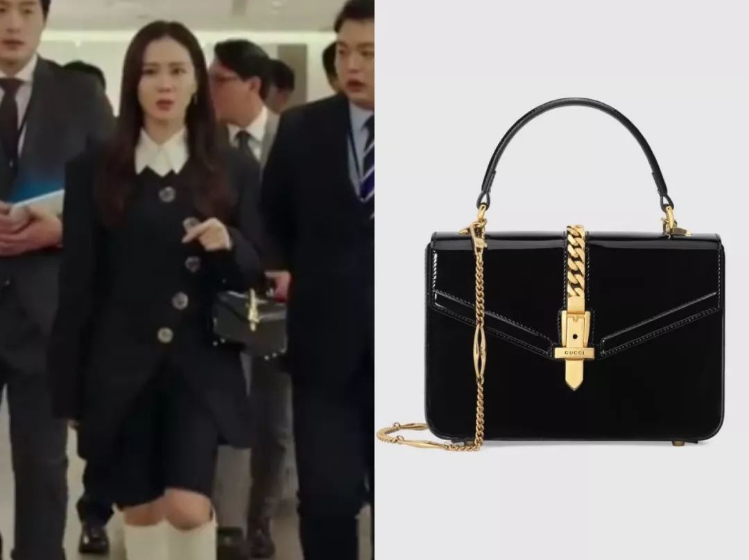 这只黑色漆皮包包也是新款,来自Gucci Sylvie 1969系列,方方正正的造型很复古。