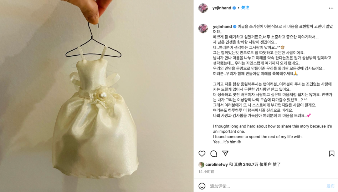 一小时后,新娘孙艺珍也po出了“婚纱”照片,感谢粉丝支持,大赞老公温暖踏实!
