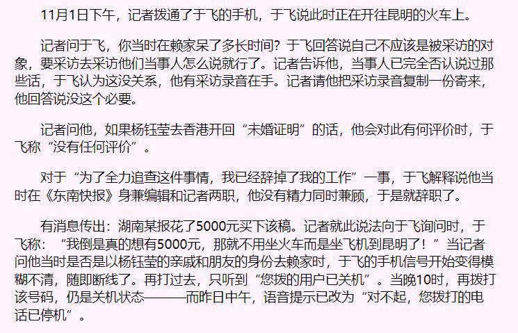 此後於飛又電話采訪了楊鈺瑩。