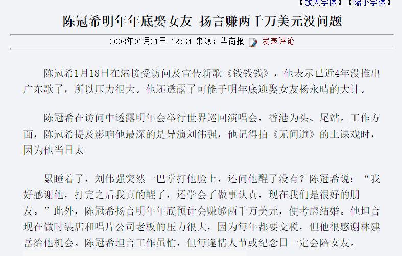 正因为这一点,2008年1月18日在接受采访时,陈冠希才表示要和杨永晴在2009年底成婚。