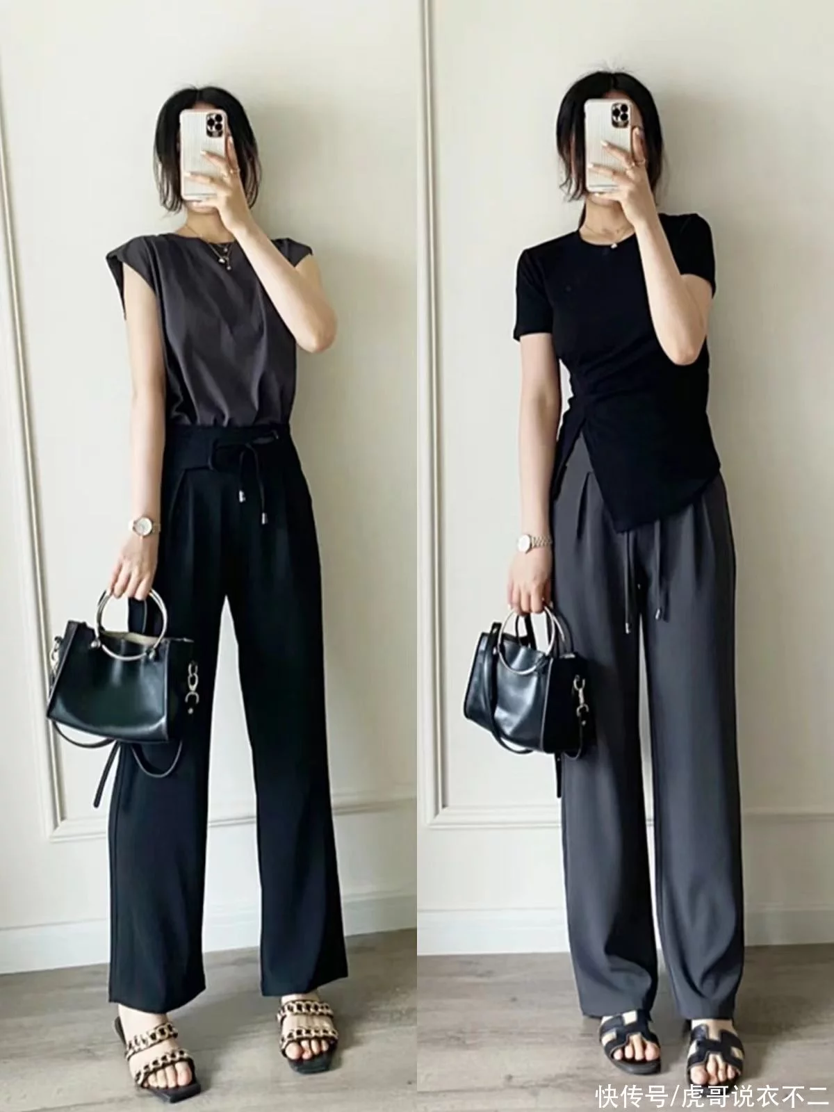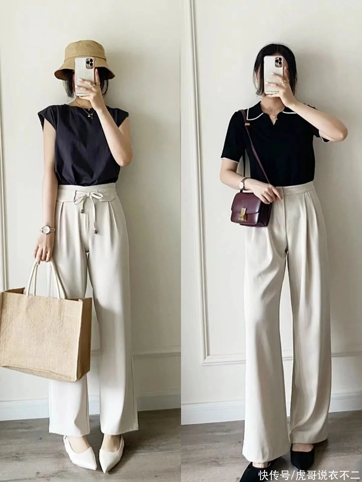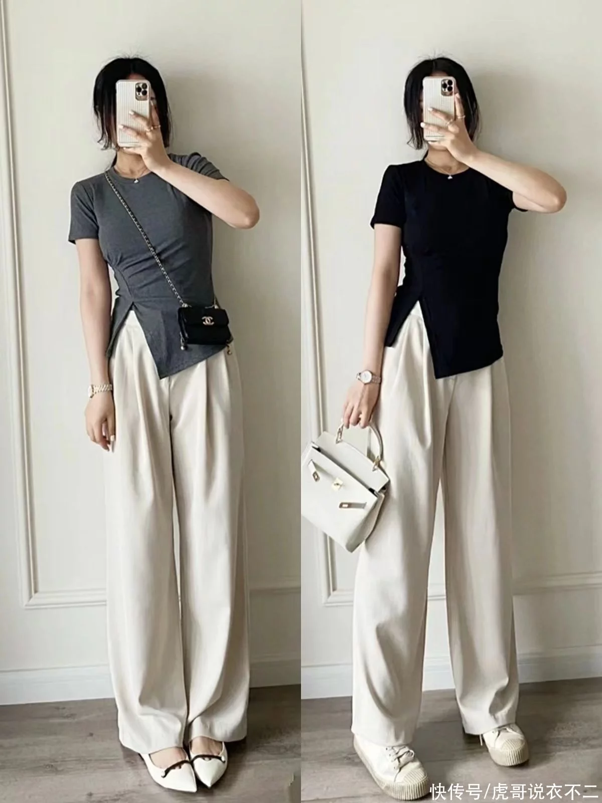 上面这两种材质的阔腿裤都非常百搭,与平底鞋、带跟鞋都很合拍。