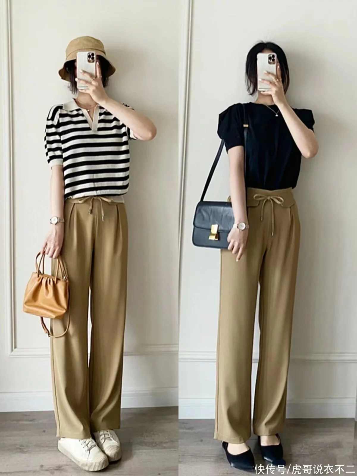 提到深受好评的阔腿西裤款式,自然不能不提卡其色款式了。卡其色是既自带成熟气息又很高级的颜色,附着在垂坠西裤上能够提升造型的正式感。