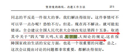 “全会建议全国人民代表大会修改宪法第四十五条,取消其中关于‘四大’即大鸣、大放、大字报、大辩论的规定,这在保障国家政治生活的安定方面,也是一个很重要的问题。”