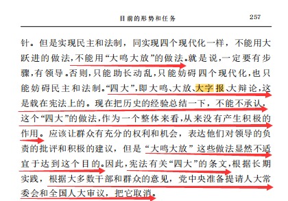 “实现民主和法制,同实现四个现代化一样,不能用大跃进的做法,不能用‘大鸣大放’的做法。就是说,一定要有步骤,有领导。否则,只能助长动乱,只能妨碍四个现代化,也只能妨碍民主和法制。‘四大’,即大鸣、大放、大字报、大辩论,这是载在宪法上的。现在把历史的经验总结一下,不能不承认,这个‘四大’的做法,作为一个整体来看,从来没有产生积极的作用。应该让群众有充分的权利和机会,表达他们对领导的负责的批评和积极的建议,但是‘大鸣大放’这些做法显然不适宜于达到这个目的。因此,宪法有关‘四大’的条文,根据长期实践,根据大多数干部和群众的意见,党中央准备提请人大常委会和全国人大审议,把它取消。”