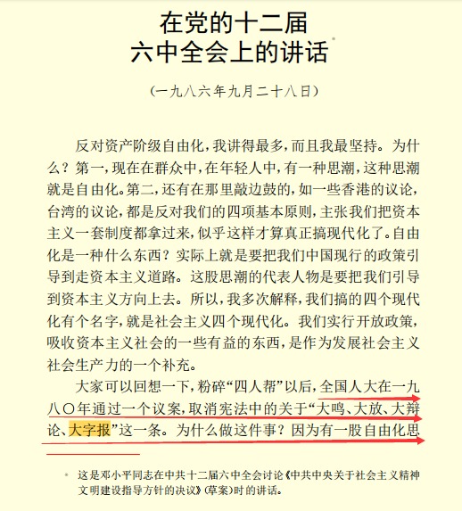“大家可以回想一下,粉碎‘四人帮’以后,全国人大在一九八○年通过一个议案,取消宪法中的关于‘大鸣、大放、大辩论、大字报’这一条。为什么做这件事?因为有一股自由化思潮。搞自由化,就会破坏我们安定团结的政治局面。”