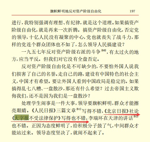 “处理学生闹事是一件大事,领导要旗帜鲜明,群众才能擦亮眼睛。《人民日报》三篇文章〔81〕写得不错,《北京日报》社论《大字报不受法律保护》写得也不错,李瑞环在天津的讲话〔82〕也不错。正因为态度鲜明了,给积极分子鼓了气,中间群众才能站过来。领导态度坚决了,就闹不起来了。”