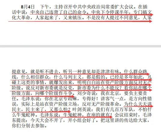 “开两个会,一个是大区书记参加的中央工作会,另一个是起草文化大革命文件的会。讲了一些文化大革命的工作,主要讲工作组要撤,要改变派工作组的政策。前几天讲工作组不行,前市委烂了,中宣部烂了,文化部烂了,高教部也烂了,《人民日报》也不行,依靠谁呢?主要依靠广大的革命师生。六月一日公布大字报,就考虑到非如此不可。文化革命就得靠他们去做,不靠他们靠谁?你去,不了解情况,两个月也不了解,半年也不了解,一年也不行。如翦伯赞写了那么多书,你们谁看过,小平看过吗?(邓小平:没有)哦,没有,知道你也没有。那么你能斗得了他吗?只有他们能了解情况,我去也不行,只有依靠革命师生。