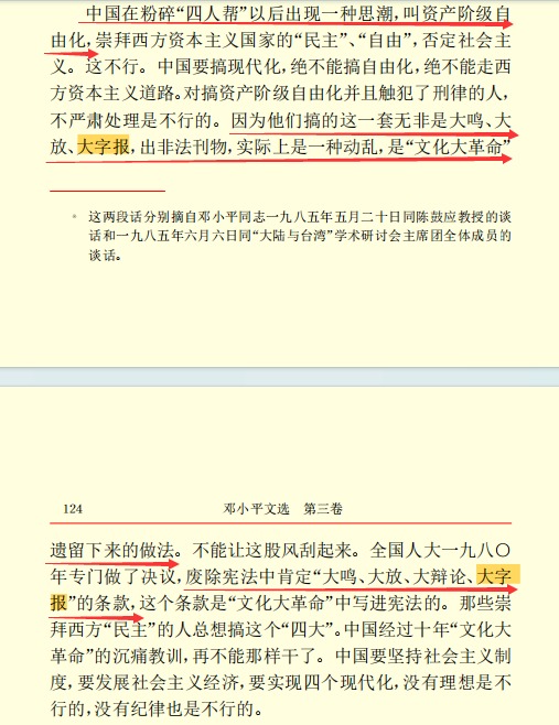 “中国在粉碎‘四人帮’以后出现一种思潮,叫资产阶级自由化,崇拜西方资本主义国家的‘民主’、‘自由’,否定社会主义。这不行......因为他们搞的这一套无非是大鸣、大放、大字报,出非法刊物,实际上是一种动乱,是‘文化大革命’遗留下来的做法。不能让这股风刮起来。全国人大一九八○年专门做了决议,废除宪法中肯定‘大鸣、大放、大辩论、大字报’的条款,这个条款是‘文化大革命’中写进宪法的。那些崇拜西方‘民主’的人总想搞这个‘四大’”